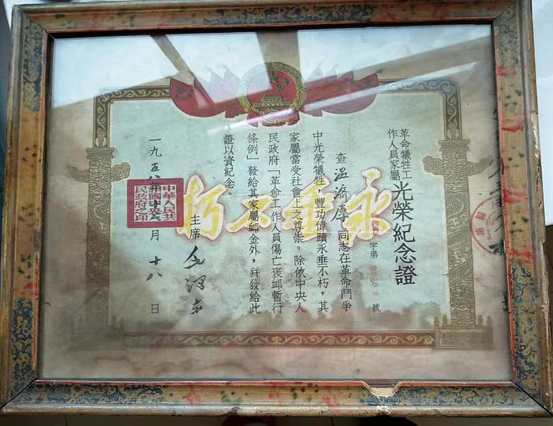 1928年5月29日,爷爷被押赴刑场。沿途路上,他拼尽全力高呼:“共产党是杀不绝的!"“共产党万岁!"路边的群众看着都忍不住落泪,不约而同地围上去,想护住爷爷。爷爷的浩然正气,连在场的伪县长都为之惊叹,民团团长也深受触动,行刑时特意竭力保全了爷爷遗体最后的尊严。1958年12月18日,中华人民共和国中央政府正式追认爷爷为革命烈士,还颁发了由毛主席亲笔签发的“革命牺牲工作人员家属光荣纪念证”,这是我们全家的荣耀。